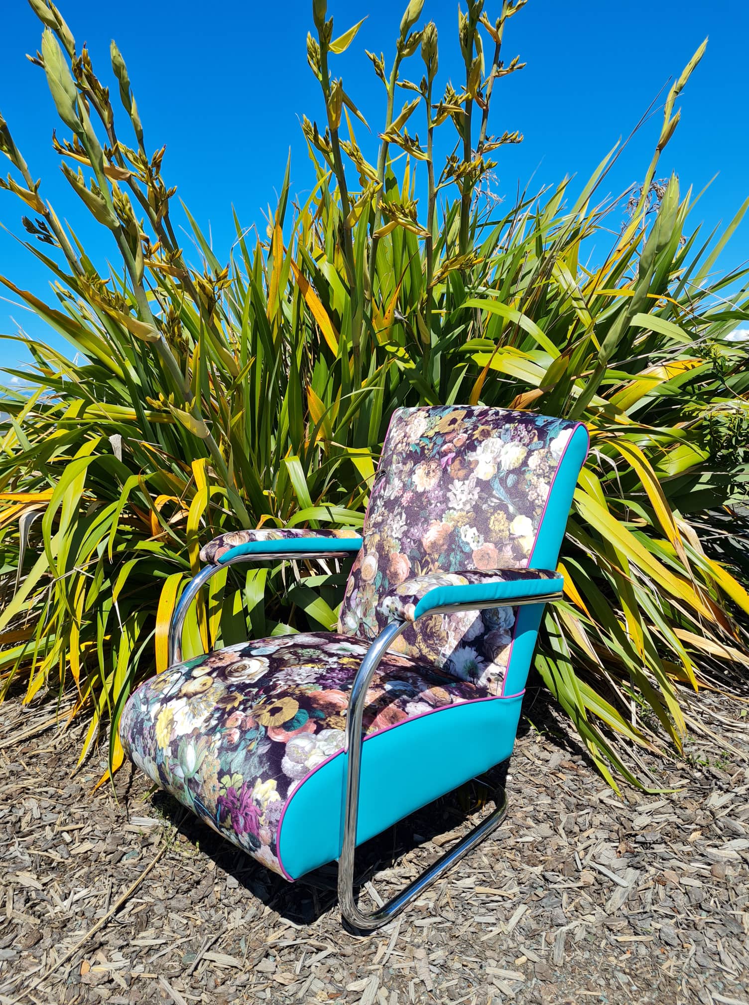 1960's Chrome Arm Chair, beautifully restored using Warwicks Flowerbomb Fabric beautiful velvet and a Wiggins Marine Grade Vinyl.