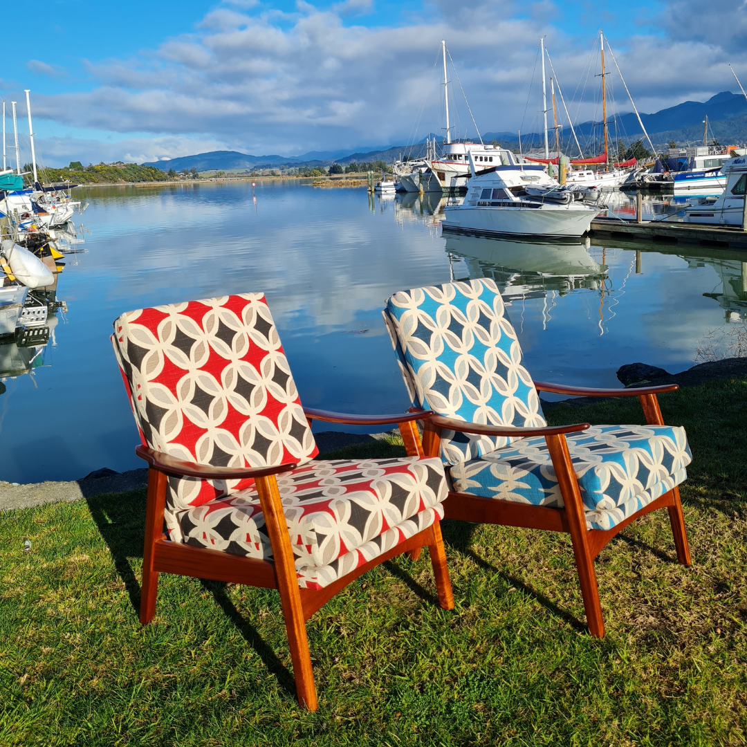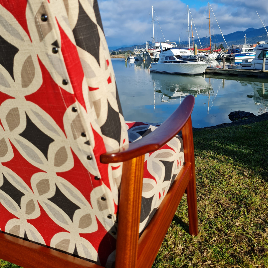 This re-vamp has been one of my favourites for quite a while - and I love how the red colouring of the fabric contrasts so well with the warm timber colouring in the chair frame. The pattern on the fabric is suggestive of a retro print, perfect for the age of this chair. Recliner.
