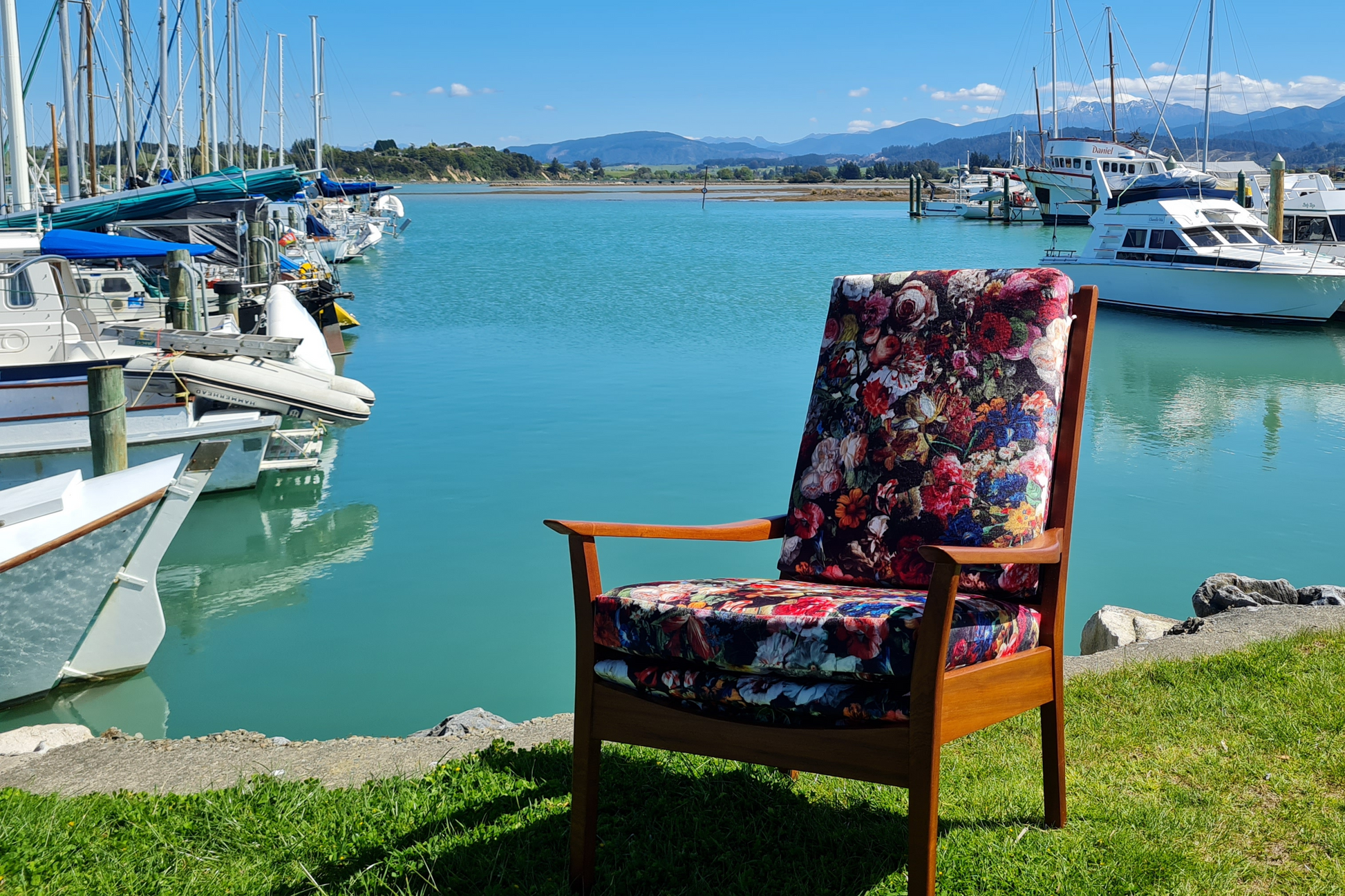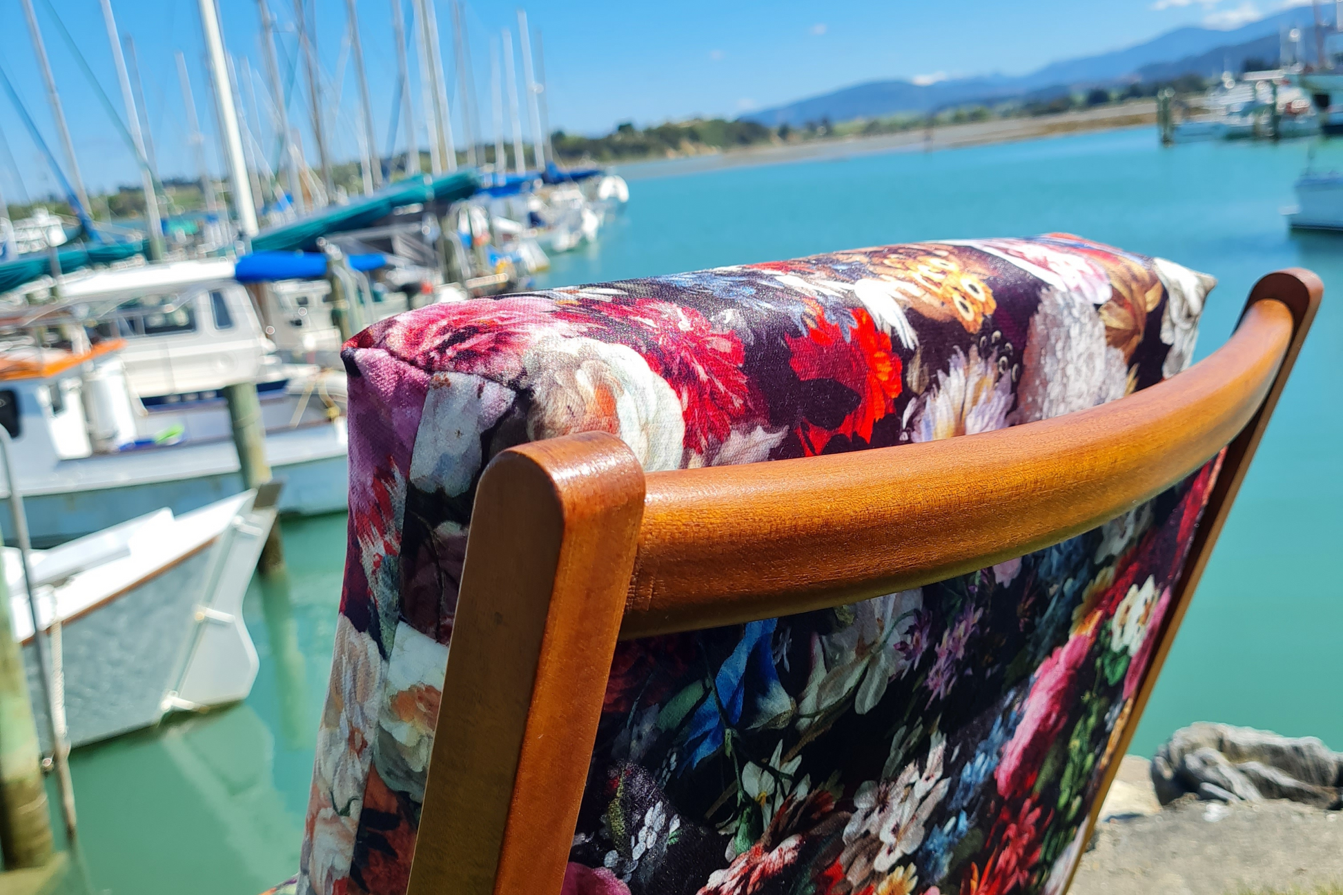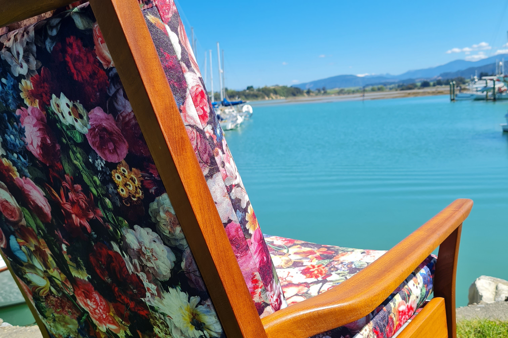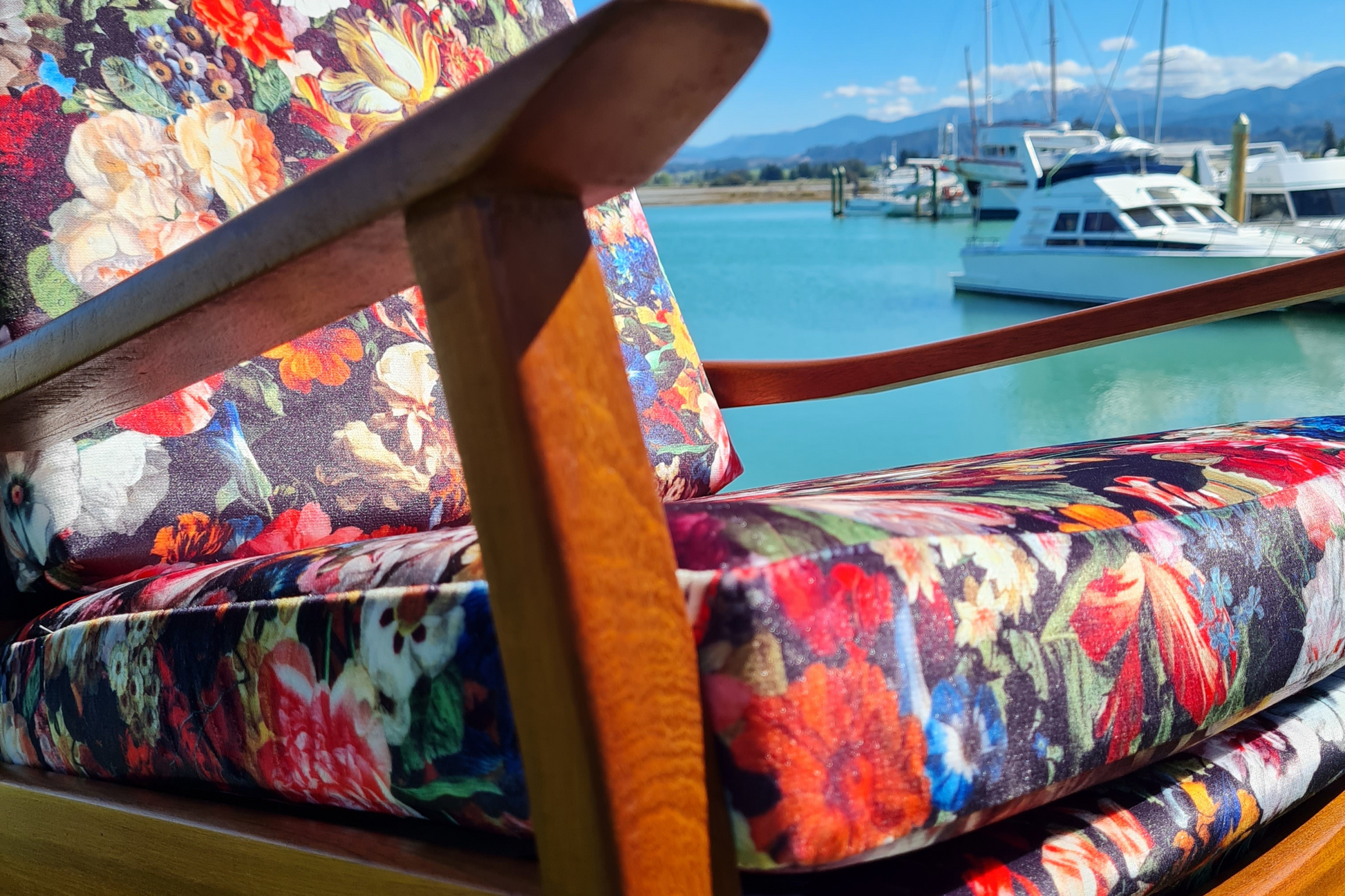 DON Furniture was a must have item in any aspiring middle-class Kiwi home during the 1960s and 70s. Upholstered using Warwicks Flower bomb Velvet Fabric.