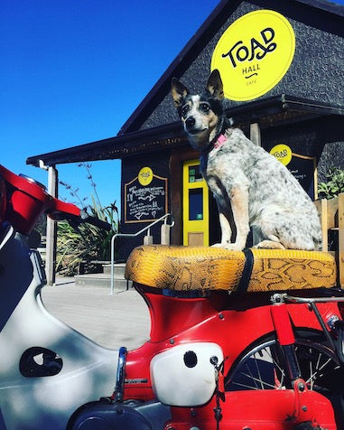 This is Dyna my dog she is a Blue Heeler / Fox Terrier. She's sitting on my 1967 Honda C50 scooter. Yes I upholstered the seat.