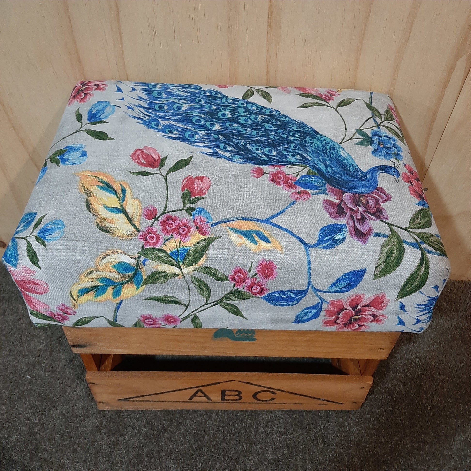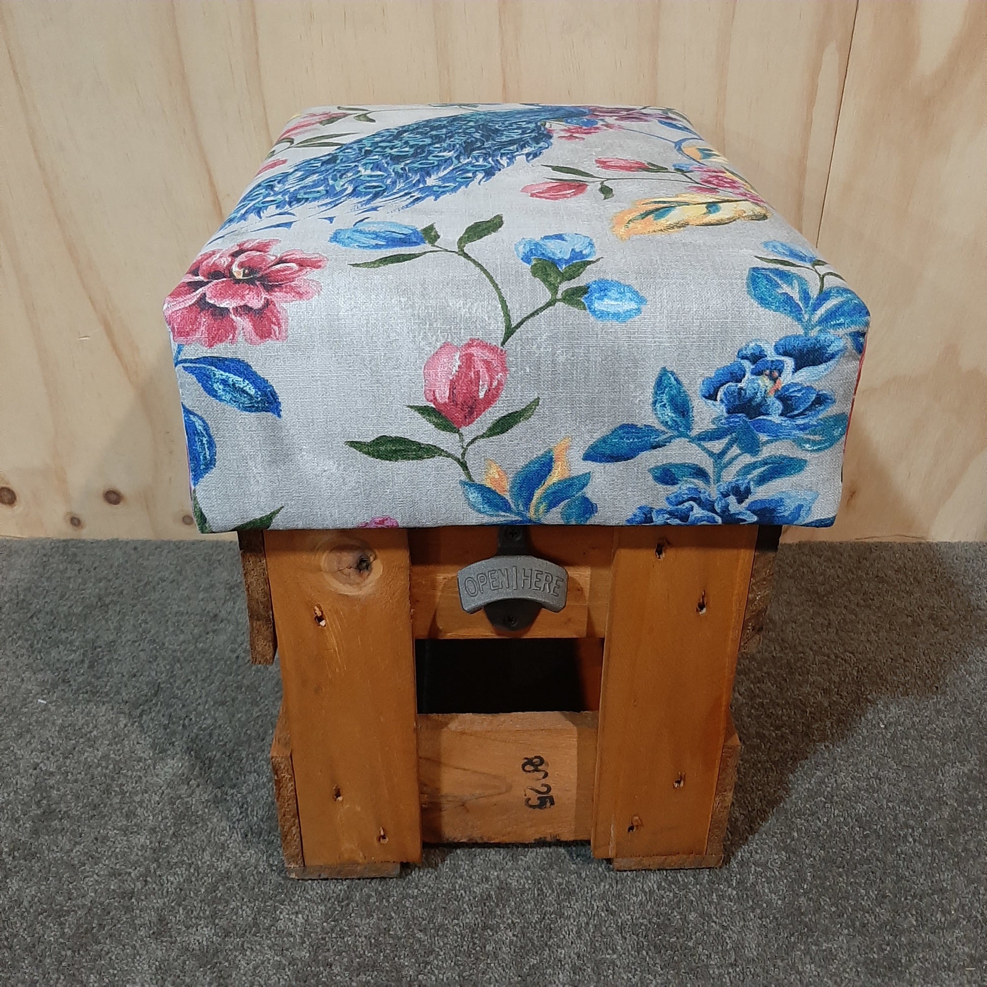 This footstool has been upcycled with the wooden base being a recycled beercrate and I have used furniture grade foam for comfort.