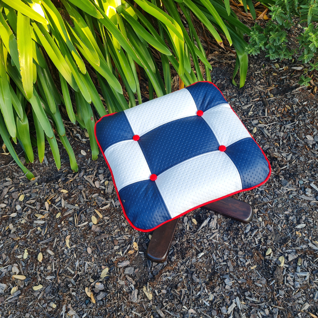 This wooden legged footstool has been beautifully restored using Marine Grade Vinyls.