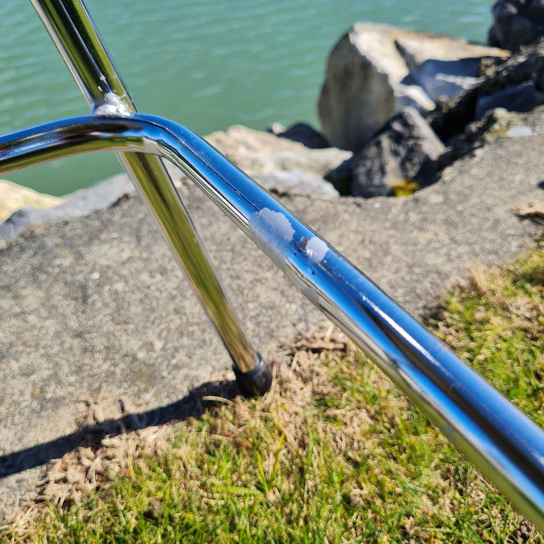 The frame has been cleaned. Upholstered in outdoor type fabric (Wipeable) and a marine grade vinyl.
