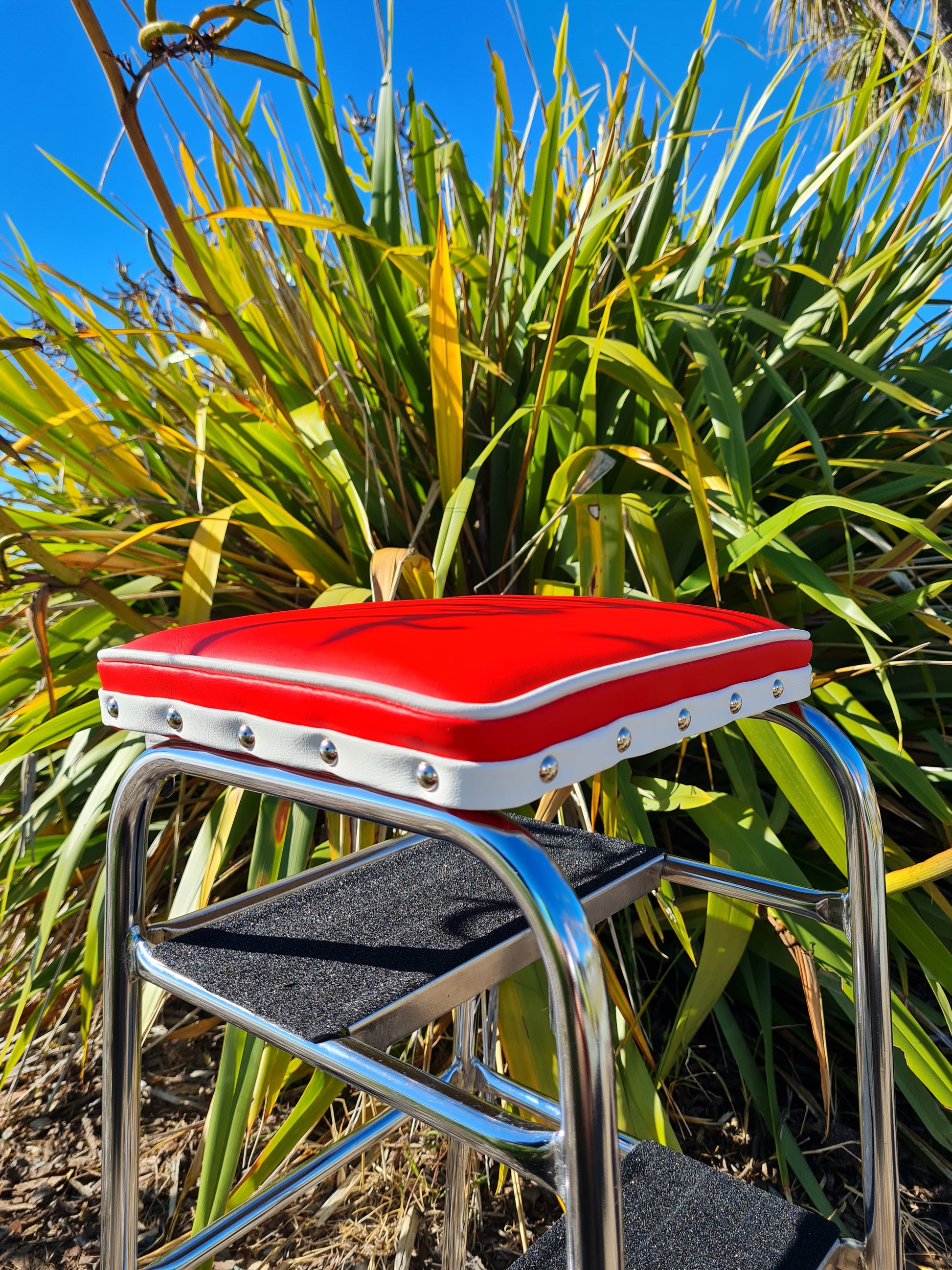 Retro Chrome Step Stool - Seat - Red with White Piping