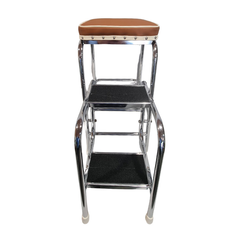 This funky stool - seat has been upcycled from 1960's. The frame has been cleaned. Upholstered in a marine grade vinyl and flower bomb by Warwicks Rubber stoppers have been replaced. The steps have had anti slip tape applied. If any surface rust showing touched up with a silver anti rust paint.