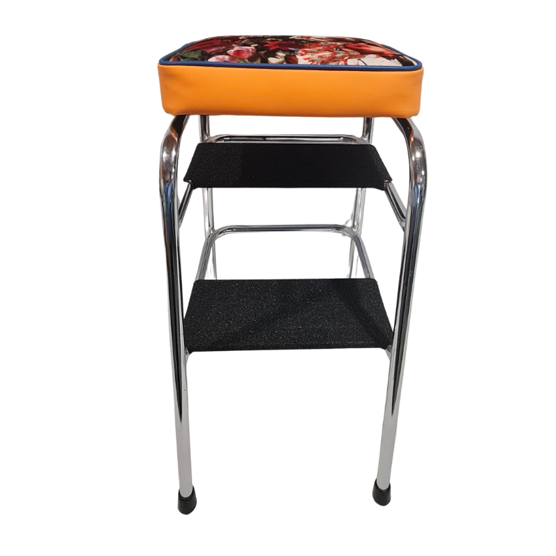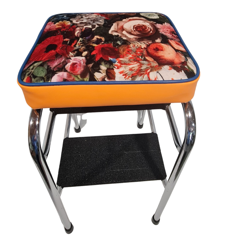 This funky stool - seat has been upcycled from 1960's. The frame has been cleaned. Upholstered in a marine grade vinyl and flowerbomb by Warwicks Rubber stoppers have been replaced. The steps have had anti slip tape applied. If any surface rust showing touched up with a silver anti rust paint.