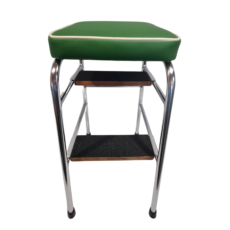 This funky stool - seat has been upcycled from 1960's. The frame has been cleaned. Upholstered in a marine grade vinyl. Rubber stoppers have been replaced. The steps have had anti slip tape applied.