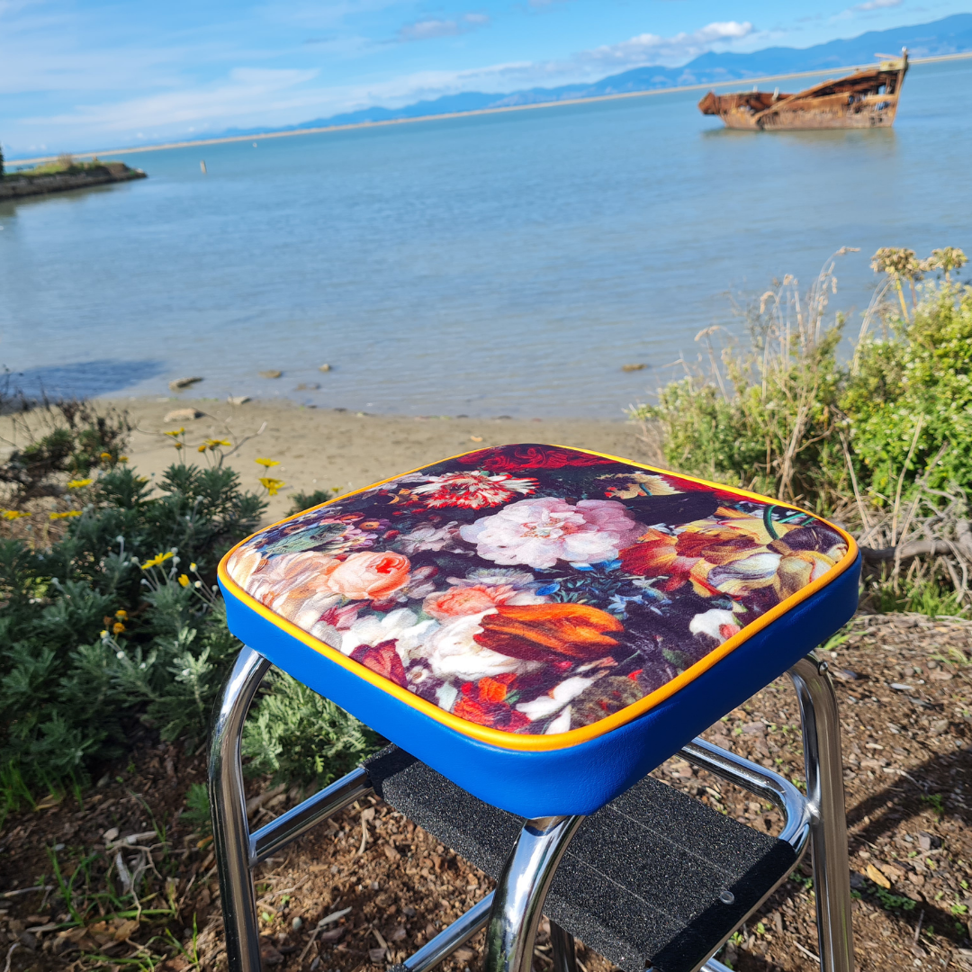 Retro Chrome Step Stool - Seat Flower Bombed Teal