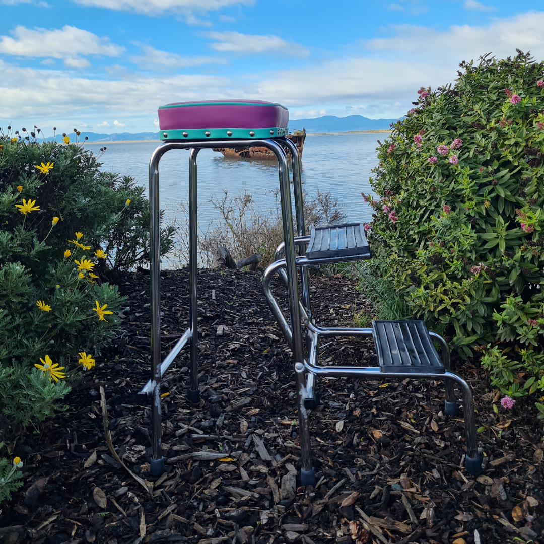 This funky stool - seat has been upcycled from 1960's. The frame has been cleaned. Upholstered in a marine grade vinyl, easy to wipe clean.