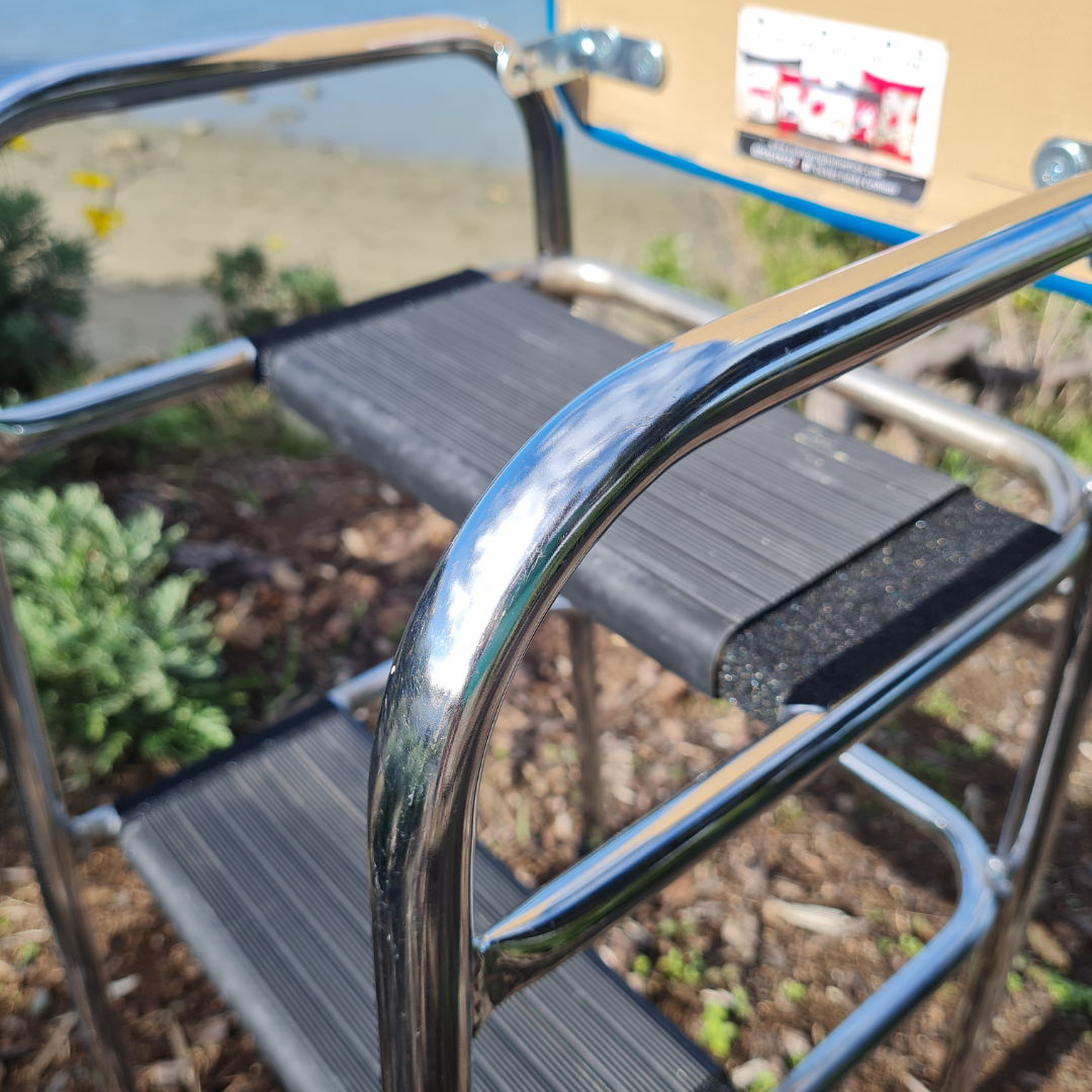 Rubber stoppers have been replaced and anti slip tape has been attached on the steps and also the original rubber. Wonderful old school step stool.