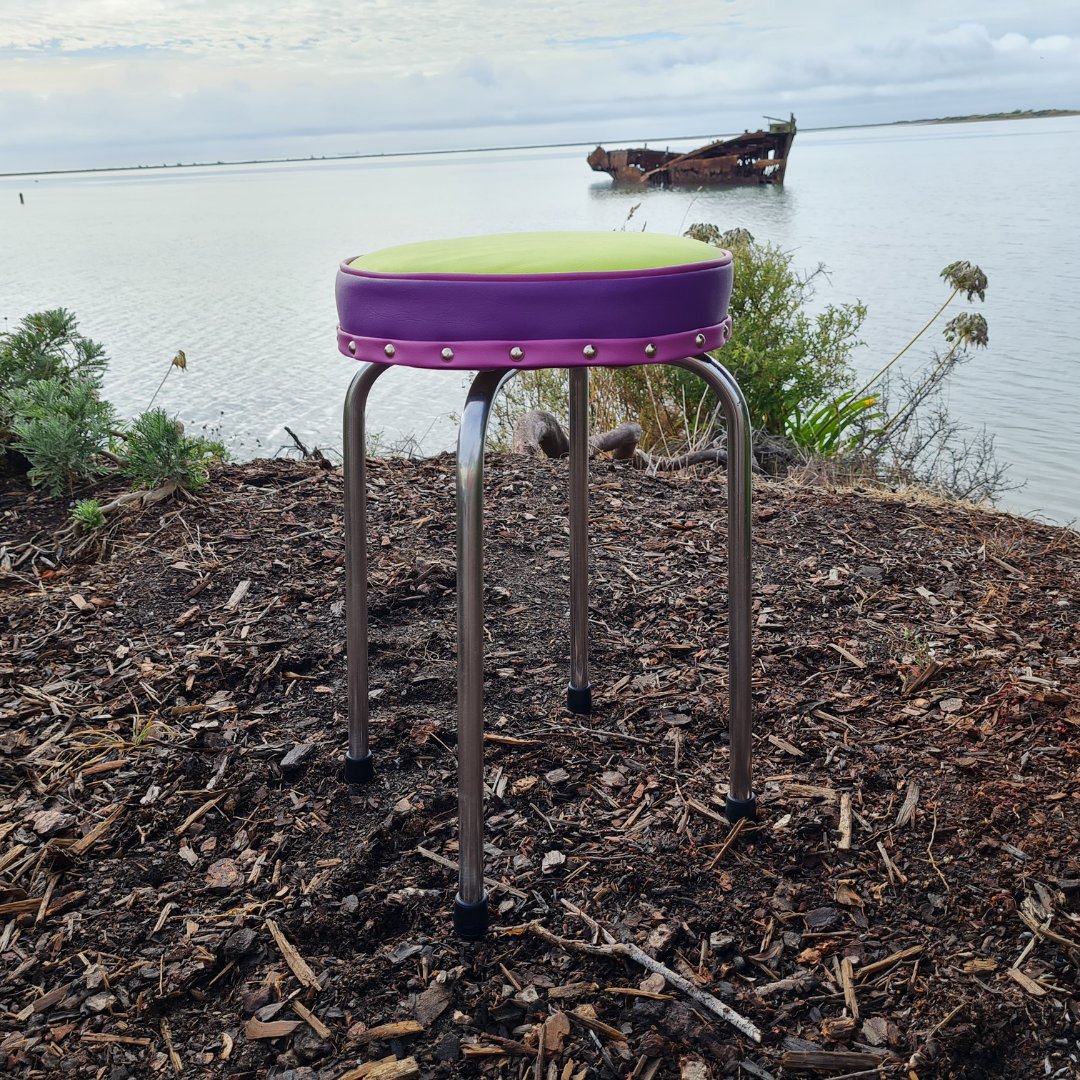 This funky stool - seat has been upcycled from 1960's. The frame has been cleaned. Upholstered in a marine grade vinyl, easy to wipe clean.