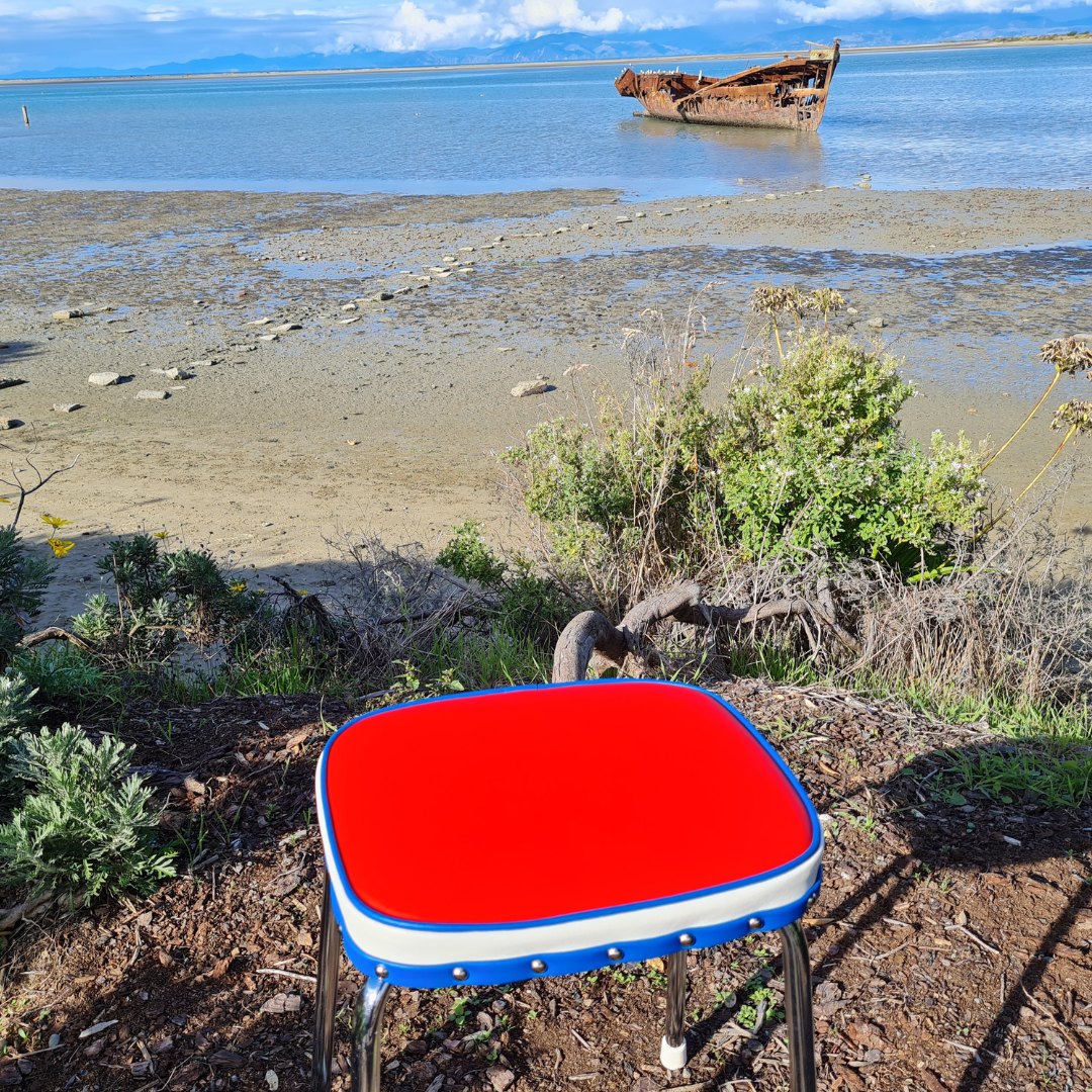 This funky stool - seat has been upcycled from 1960's. The frame has been cleaned. Upholstered in a marine grade vinyl. Super easy to wipe clean.Rubber stoppers have been replaced. Wonderful stool. It's a one of design.