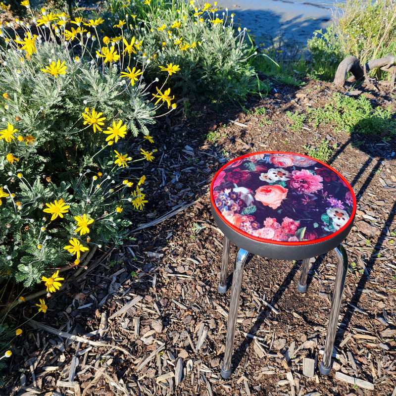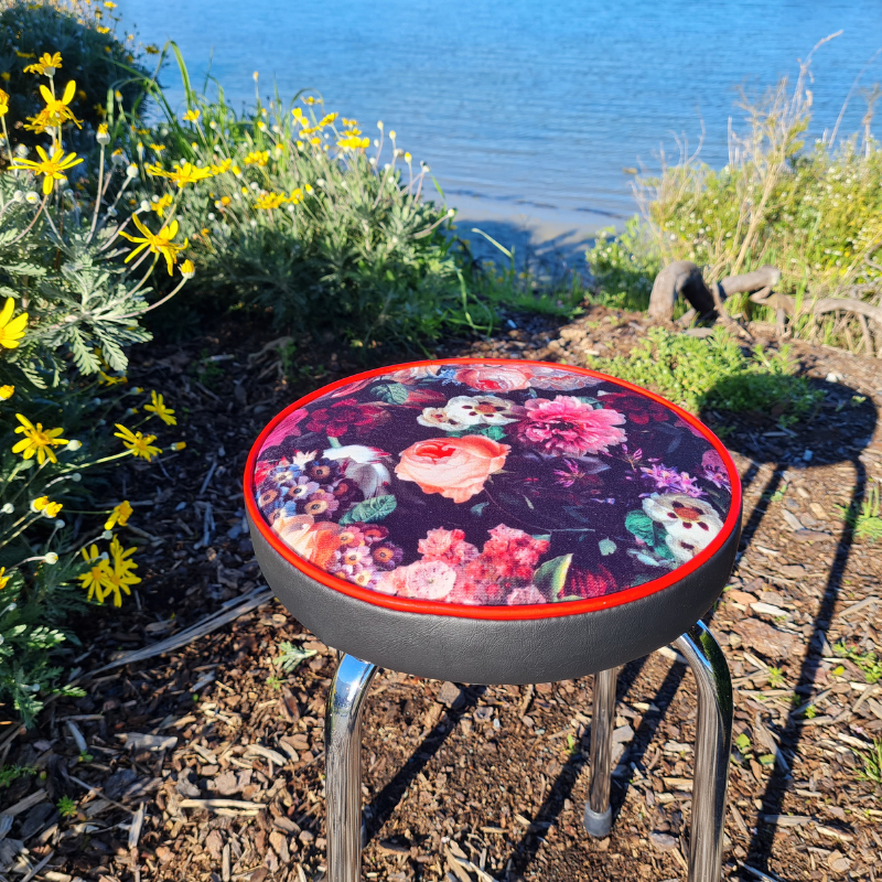 This funky stool - seat has been upcycled from 1960's. The frame has been cleaned. Upholstered in the beautiful Flower Bomb and a marine grade vinyl. Rubber stoppers have been replaced. Wonderful stool. It's a one of design.