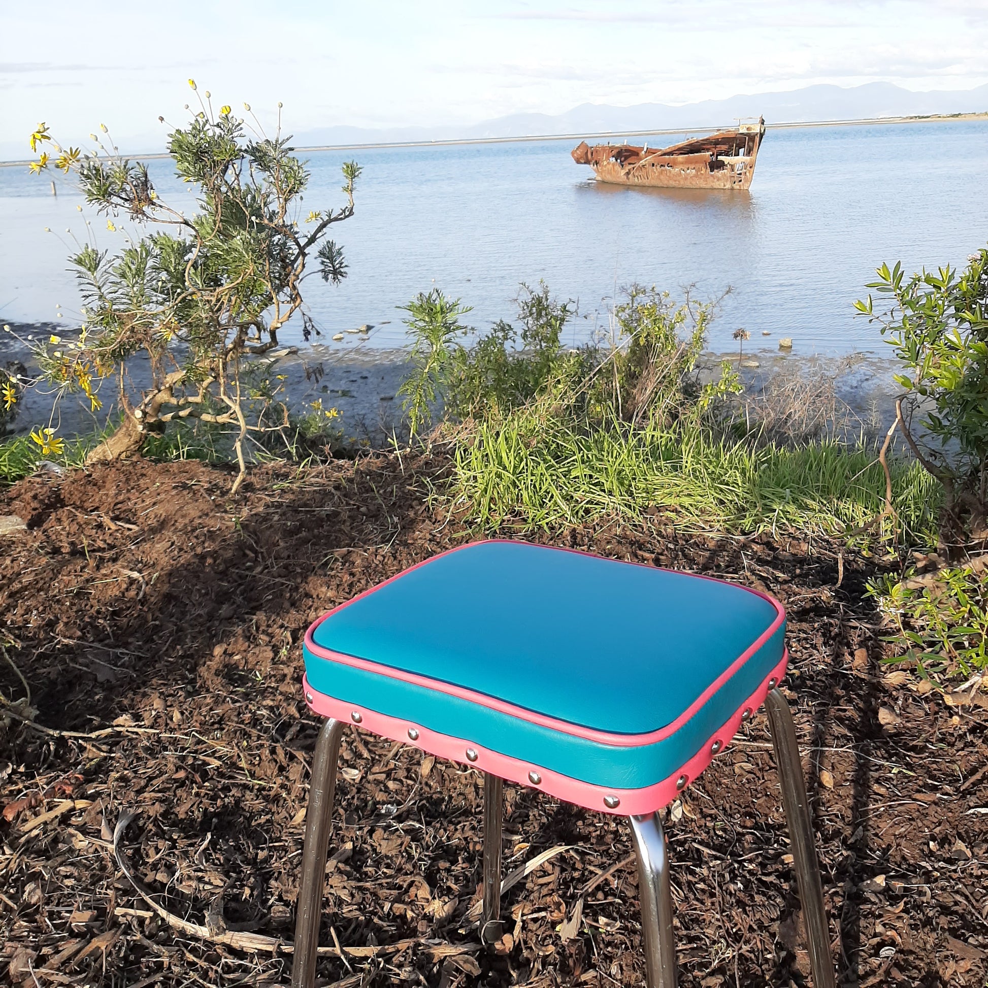 This funky stool - seat has been upcycled from 1960's. The frame has been cleaned. Upholstered in a marine grade vinyl, easy to wipe clean.