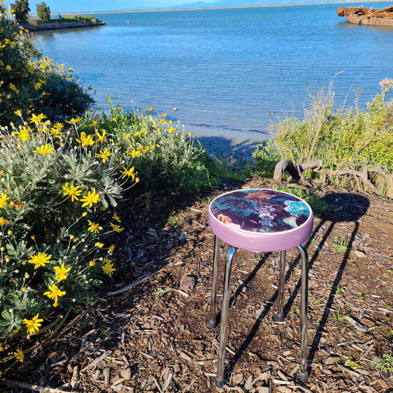 This funky stool - seat has been upcycled from 1960's. The frame has been cleaned. Upholstered in the beautiful Flower Bomb and a marine grade vinyl. Rubber stoppers have been replaced. Wonderful stool. It's a one of design.