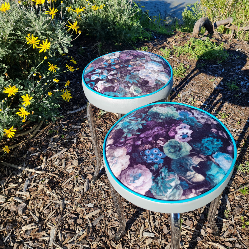 This funky stool - seat has been upcycled from 1960's. The frame has been cleaned. Upholstered in the beautiful Flower Bomb and a marine grade vinyl. Rubber stoppers have been replaced. Wonderful stool.