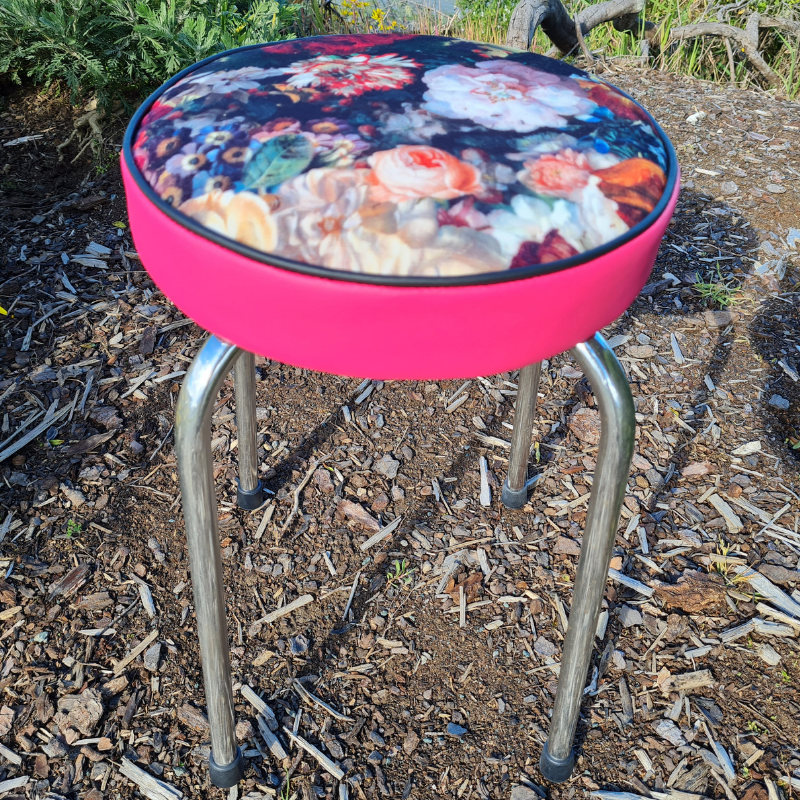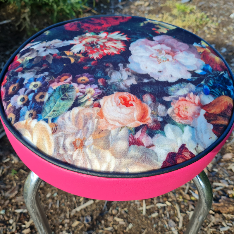This funky stool - seat has been upcycled from 1960's. The frame has been cleaned. Upholstered in the beautiful Flower Bomb and a marine grade vinyl. Rubber stoppers have been replaced. Wonderful stool.