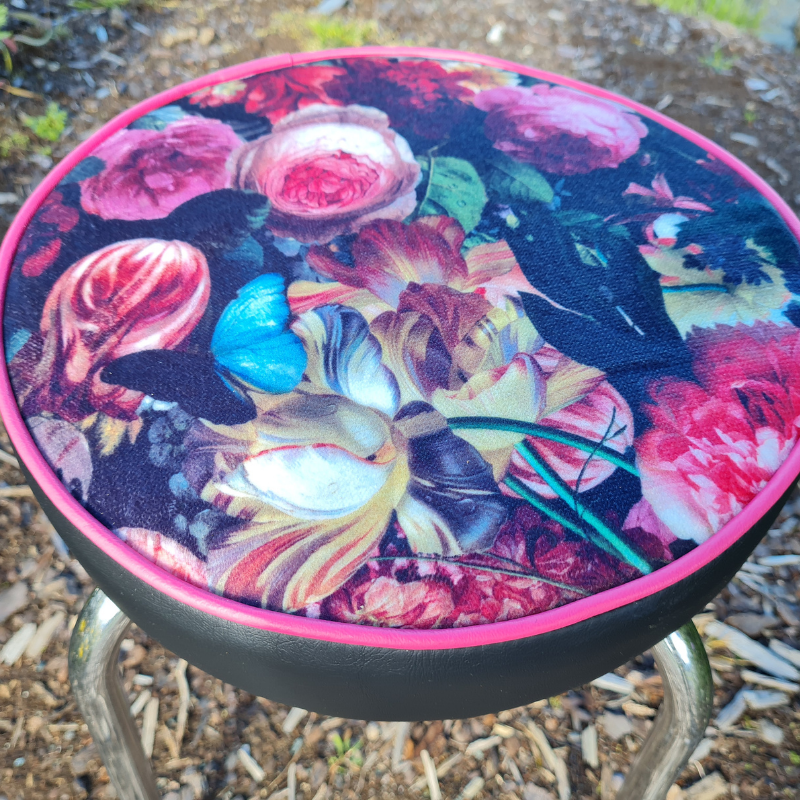 This funky stool - seat has been upcycled from 1960's. The frame has been cleaned. Upholstered in the beautiful Flower Bomb and a marine grade vinyl. Rubber stoppers have been replaced. Wonderful stool.