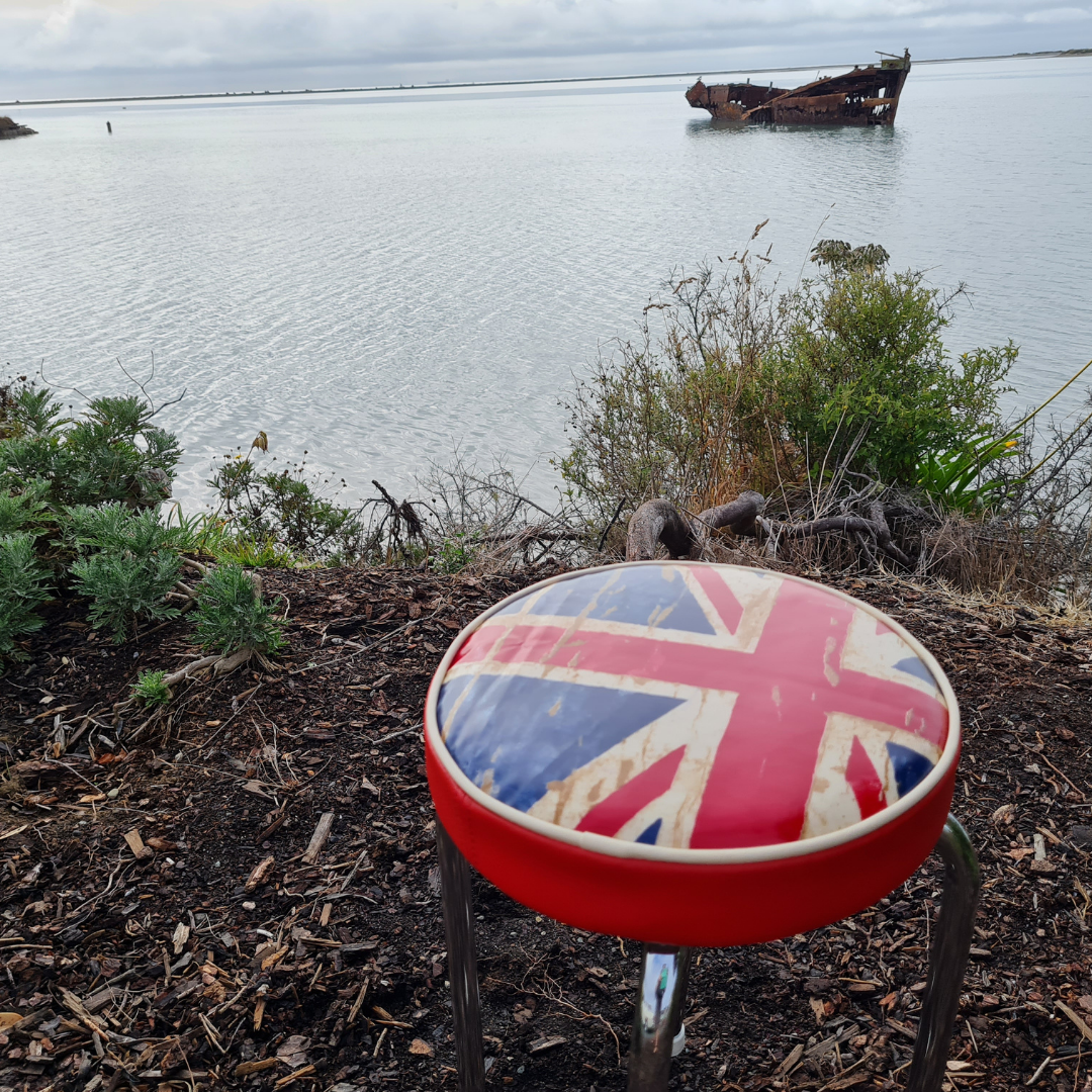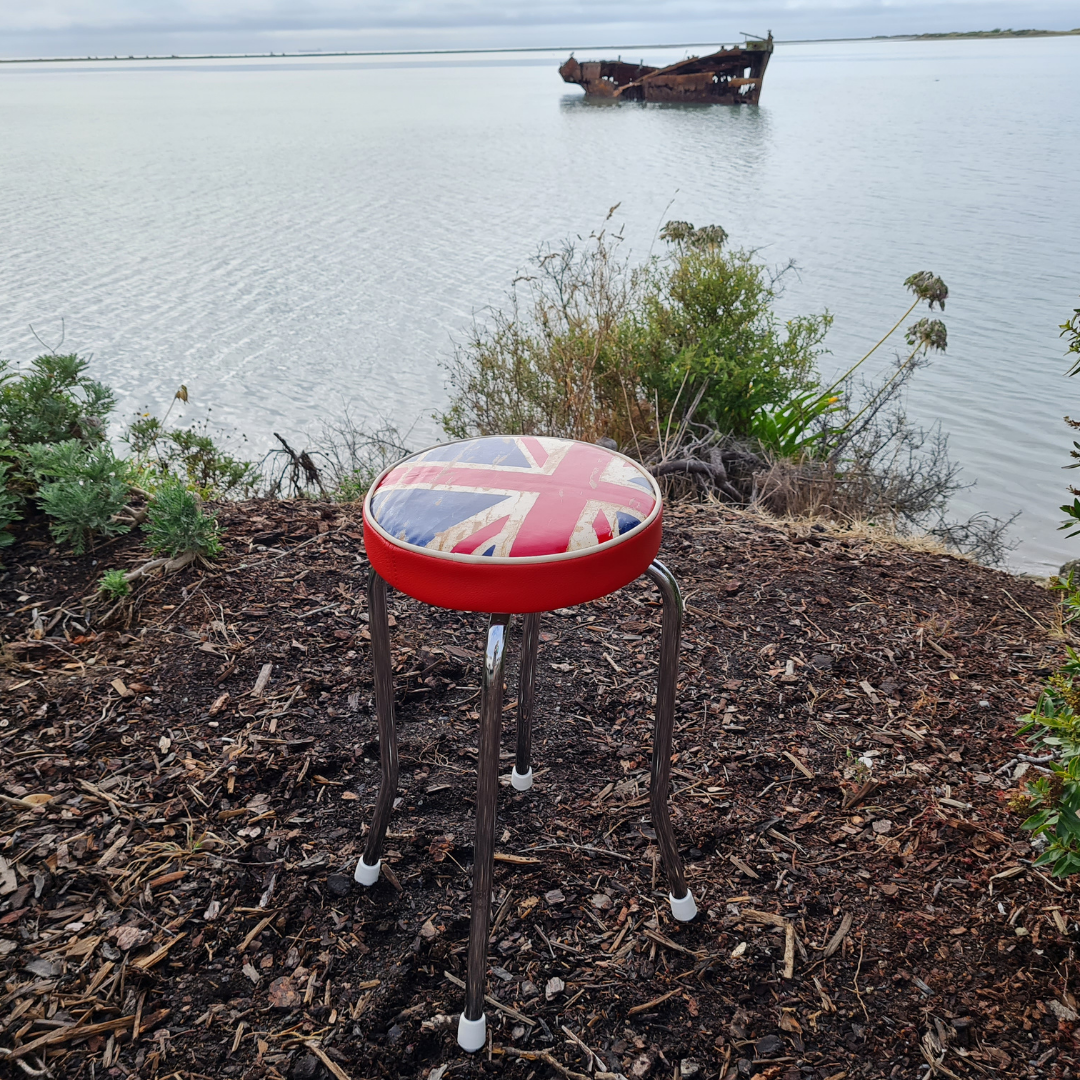 This funky stool - seat has been upcycled from 1960's. The frame has been cleaned. Upholstered in a marine grade vinyl, easy to wipe clean.