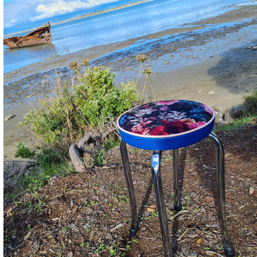 This funky stool - seat has been upcycled from 1960's. The frame has been cleaned. Upholstered in the stunning Warwicks Flower bomb fabric and a marine grade vinyl. Super easy to wipe clean. Rubber stoppers have been replaced. Wonderful stool. It's a one of design.