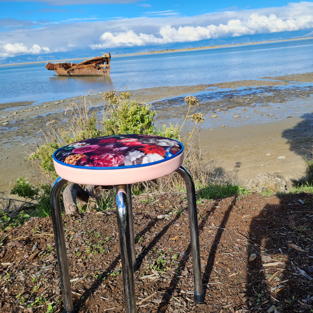 This funky stool - seat has been upcycled from 1960's. The frame has been cleaned. Upholstered in the stunning Warwicks Flower bomb fabric and a marine grade vinyl. Super easy to wipe clean. Rubber stoppers have been replaced. Wonderful stool. It's a one of design.