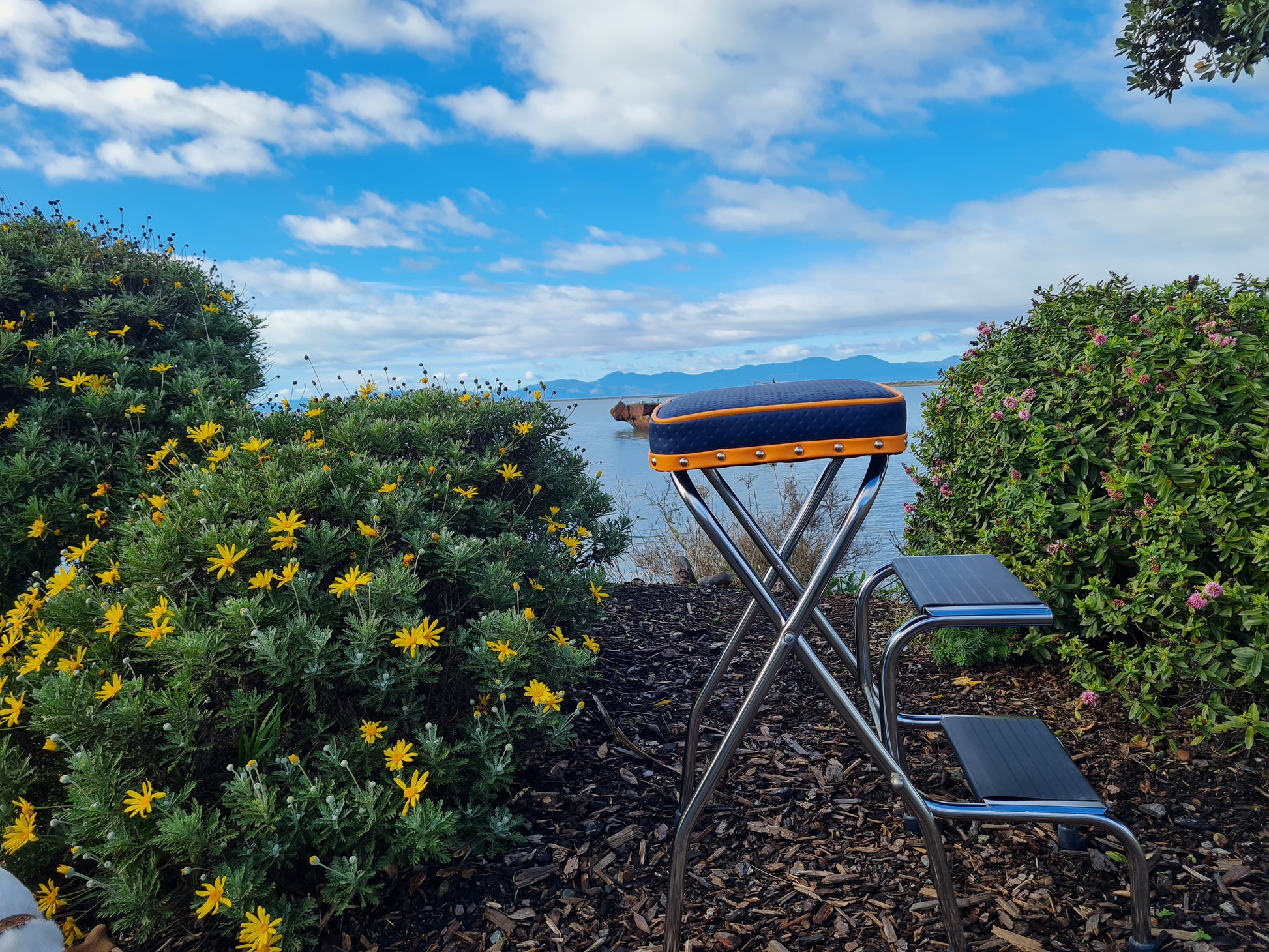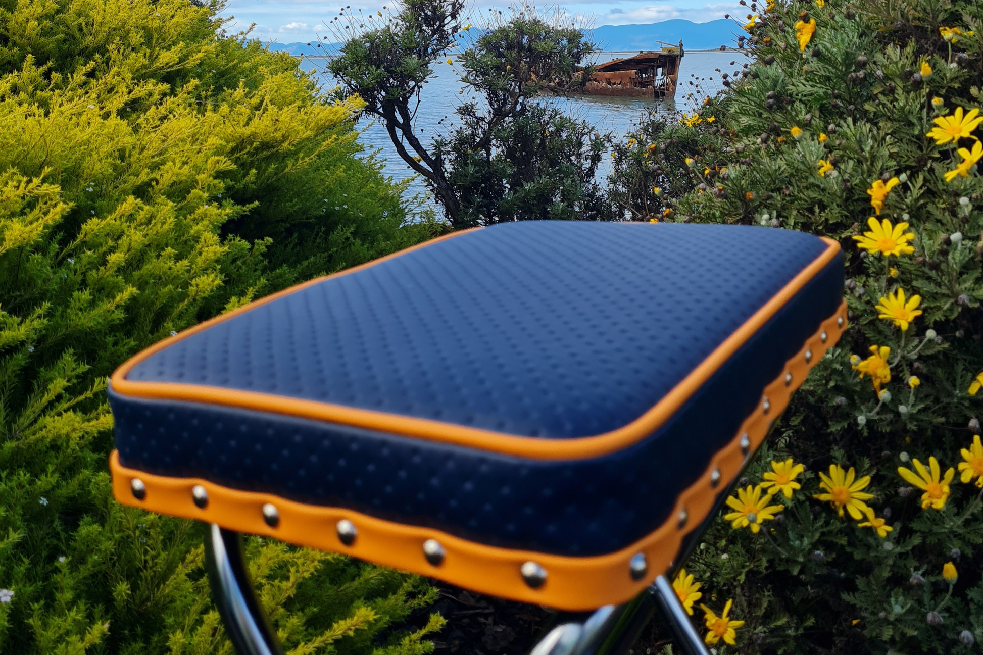 This funky stool - seat has been upcycled from 1960's. The frame has been cleaned. Upholstered in a textured marine grade vinyl. Navy with texture with a orange trim and piping. Rubber stoppers have been replaced. Wonderful stool. It's a one of design.