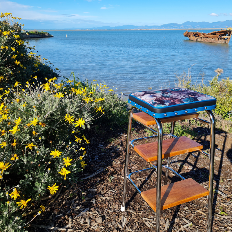 Upholstered in Warwicks Flower bomb velvet and a marine grade vinyl. Rubber stoppers have been replaced. Wonderful stool.
