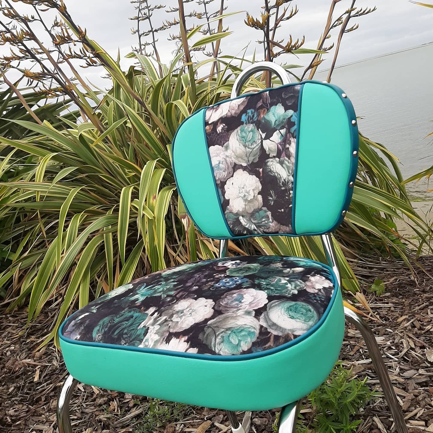 This chair have been beautifully restored using Marine Grade Vinyls and Warwick Fabric Flower Bomb (Indent Frost).