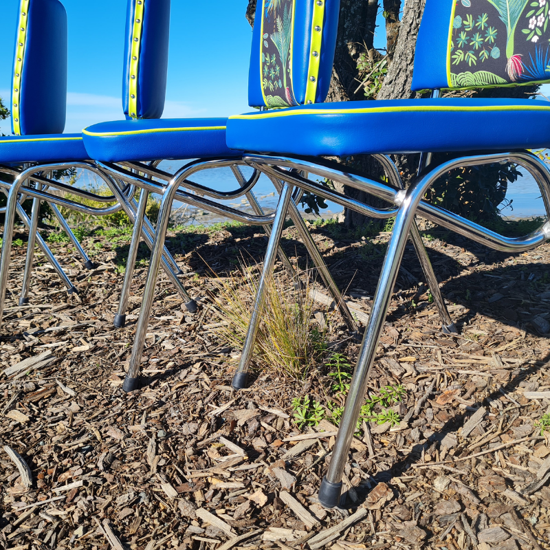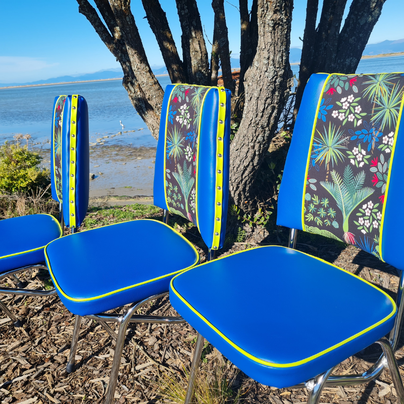 These chair's are beautifully restored using Marine Grade Vinyls and the colourful pattern is a cotton fabric..