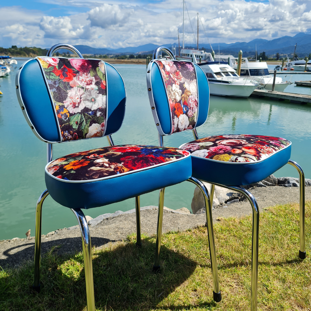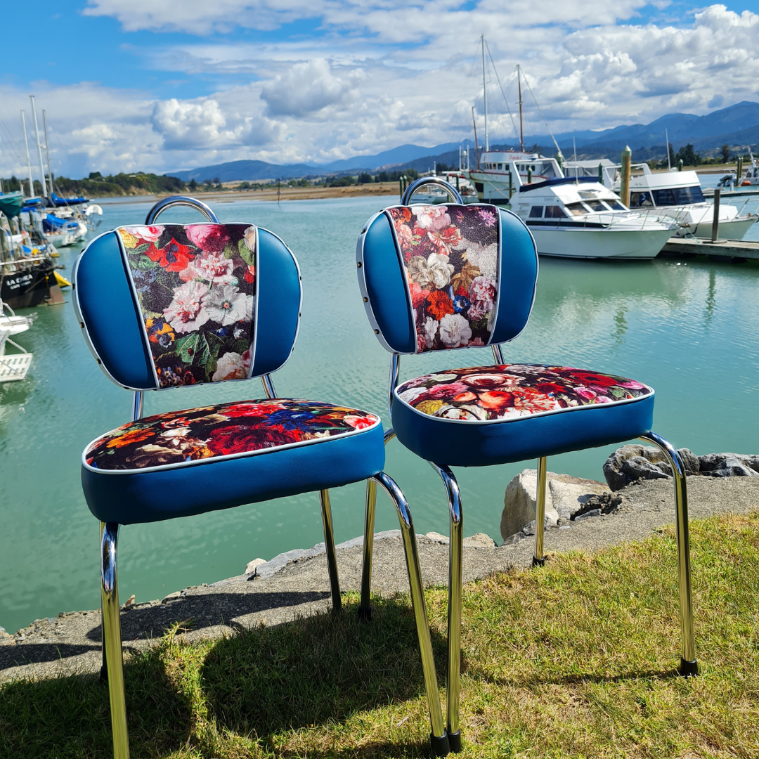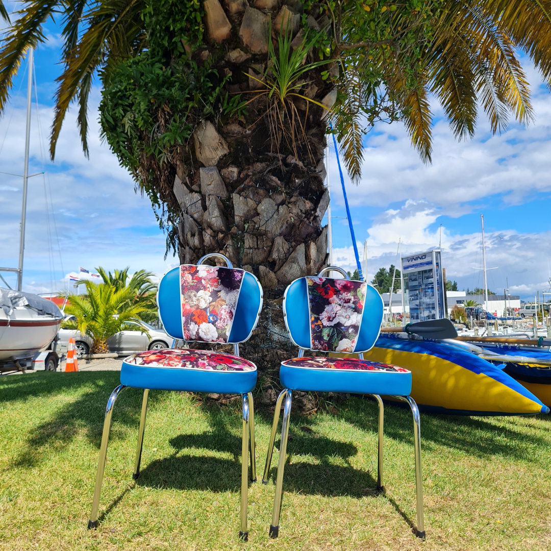 These chair's are beautifully restored using Marine Grade Vinyls and the colourful Flower bomb Fabric from Warwicks. A PAIR of chairs.