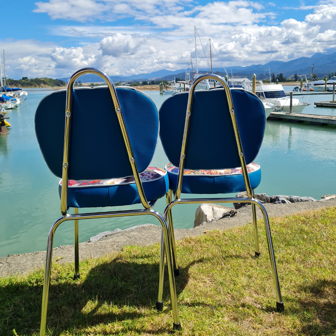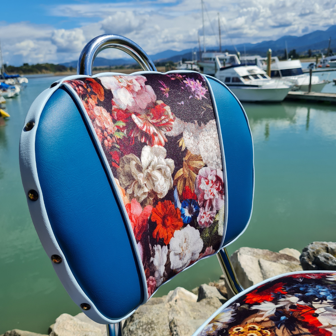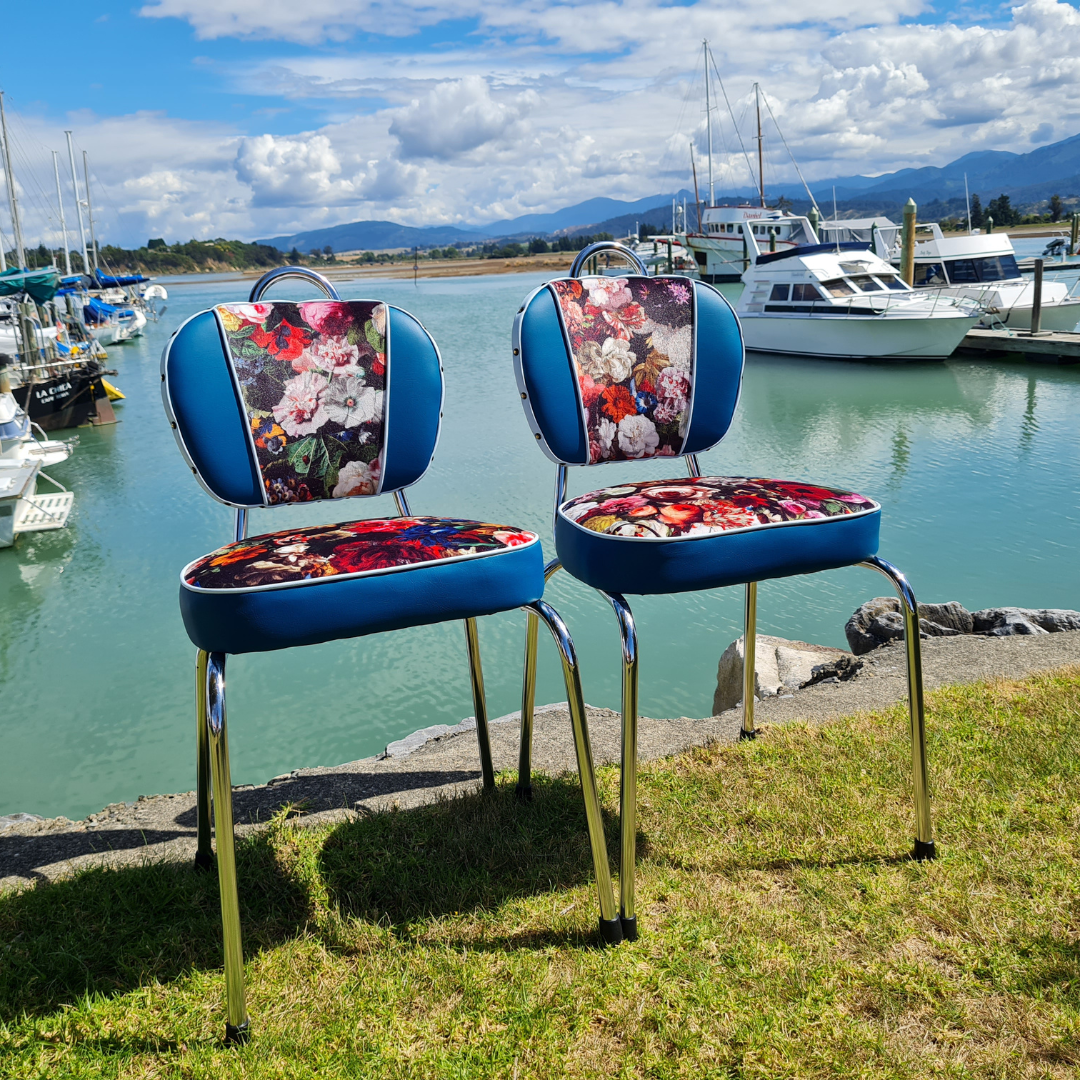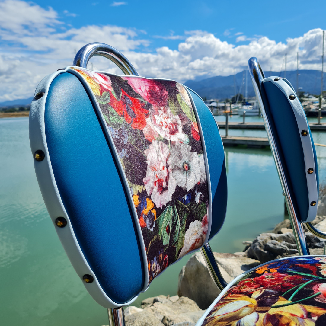 These chair's are beautifully restored using Marine Grade Vinyls and the colourful Flower bomb Fabric from Warwicks. A PAIR of chairs.