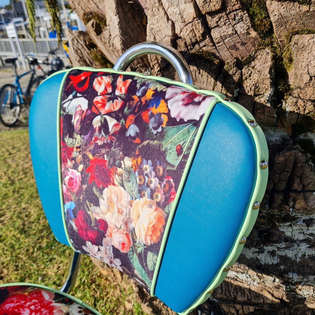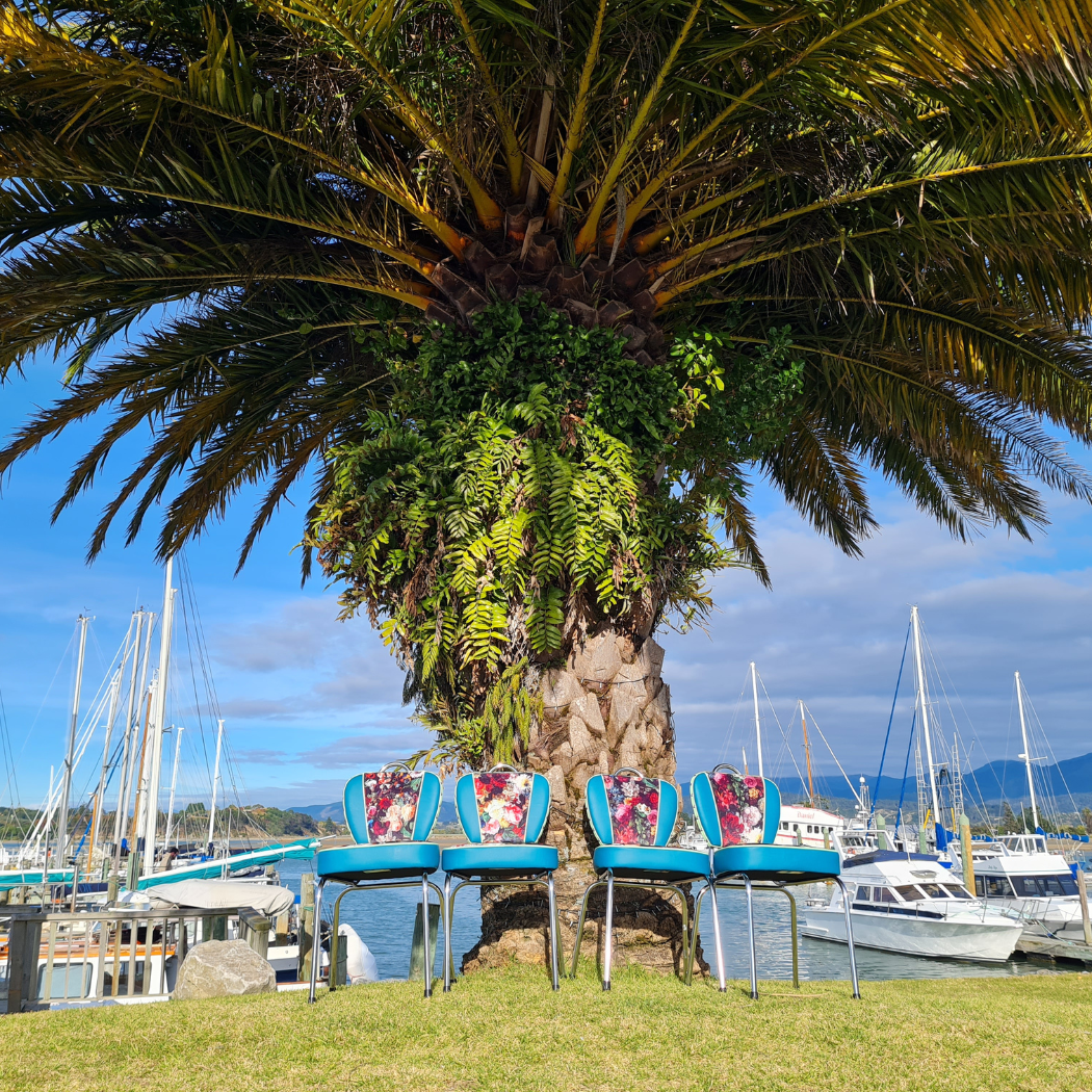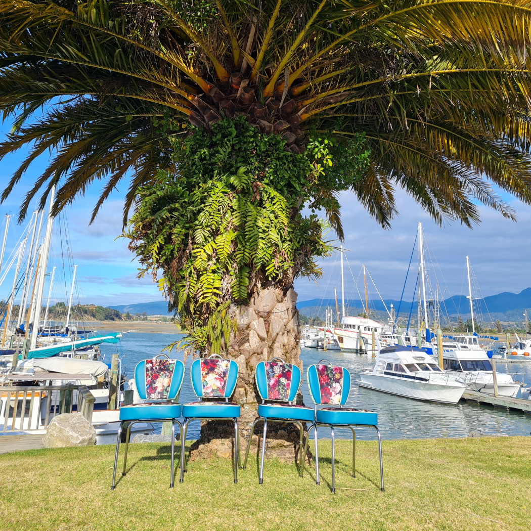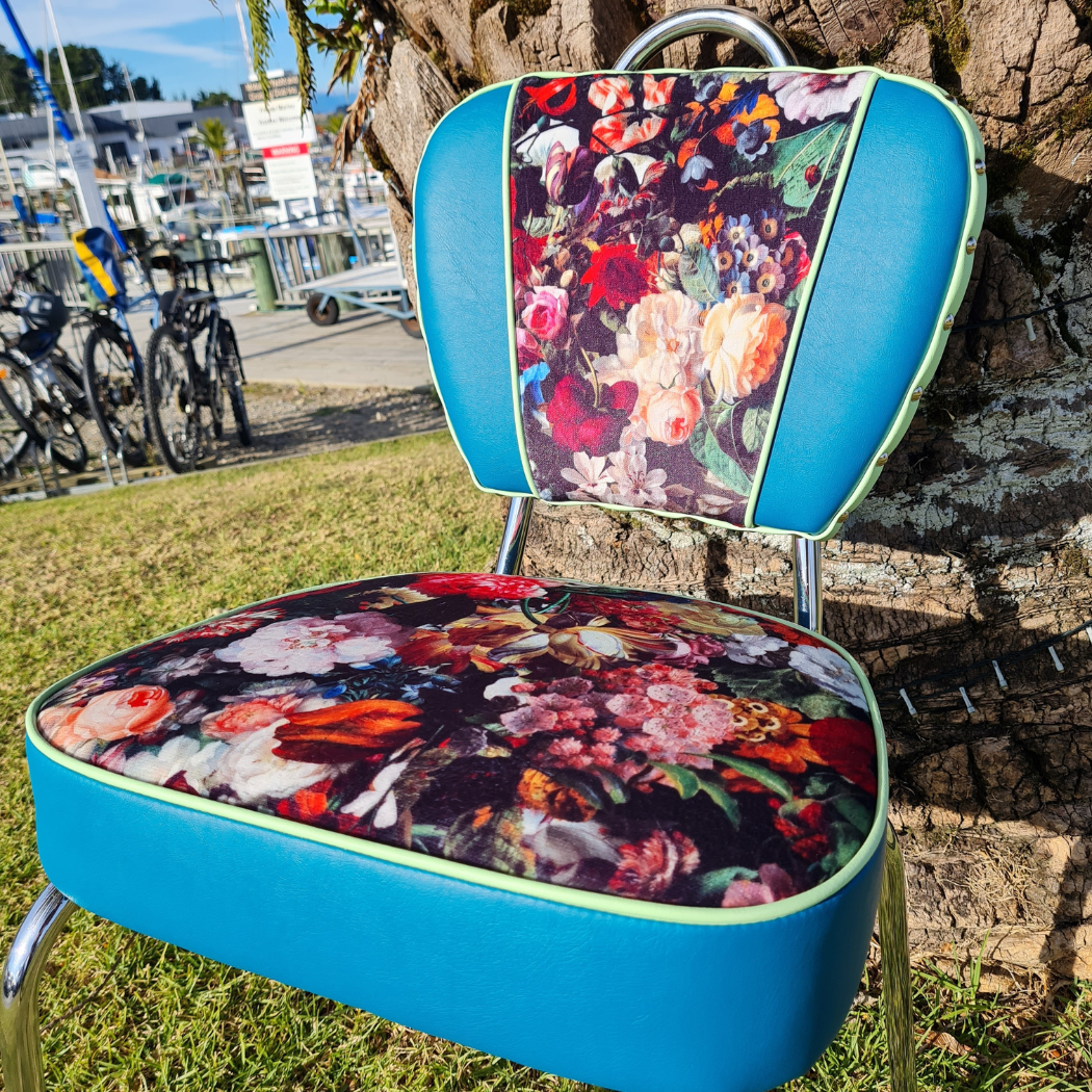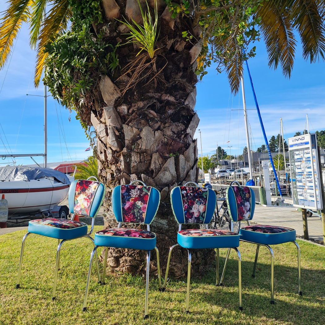 These chair's are beautifully restored using Marine Grade Vinyls and the colourful Flower bomb Fabric from Warwicks.Set of 4 chairs.