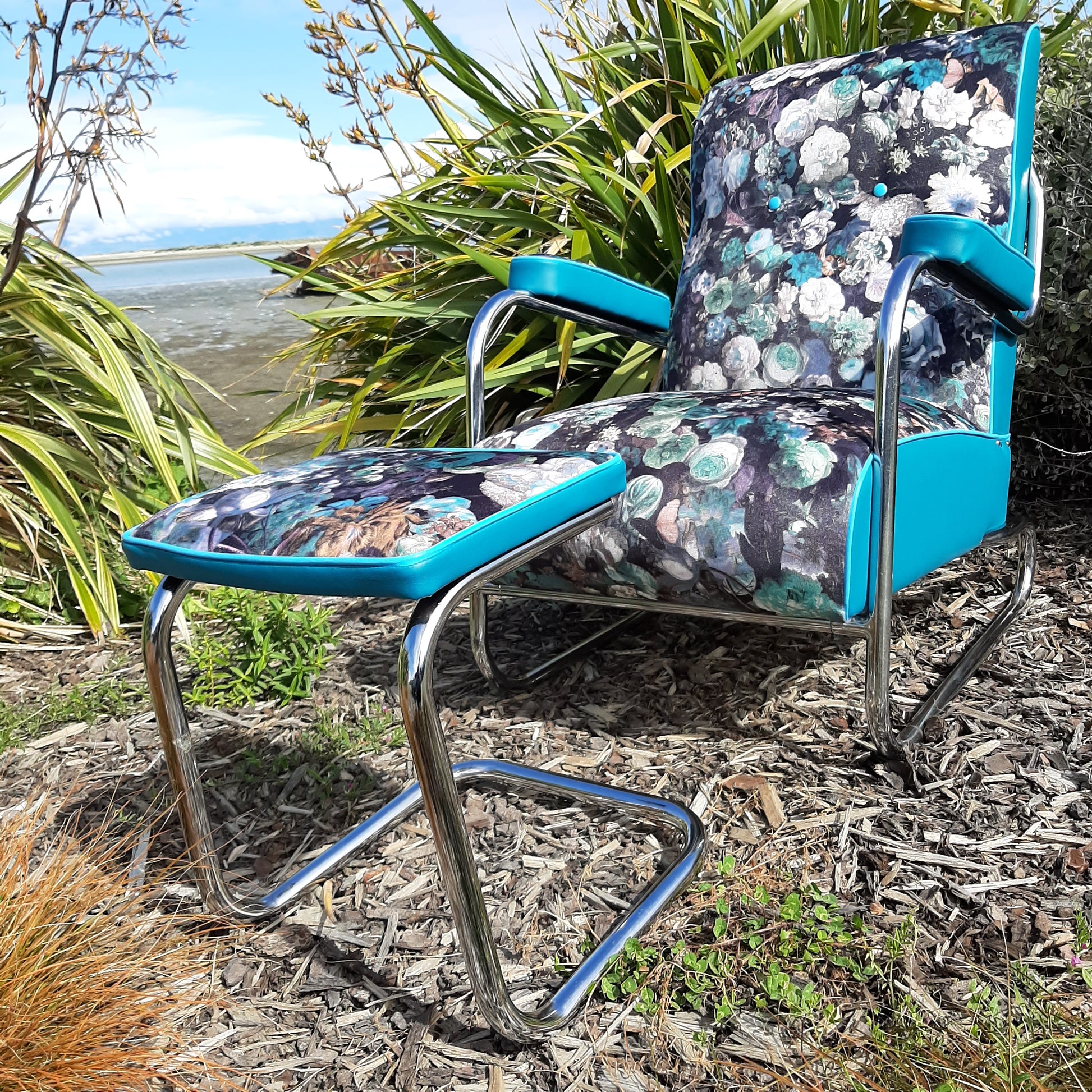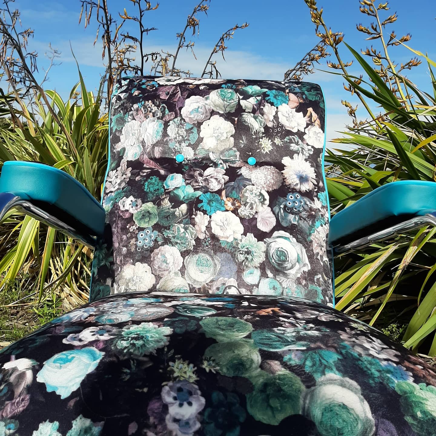 This arm chair have been beautifully restored using Marine Grade Vinyls and Warwick Fabric Flower Bomb (Indent Frost).