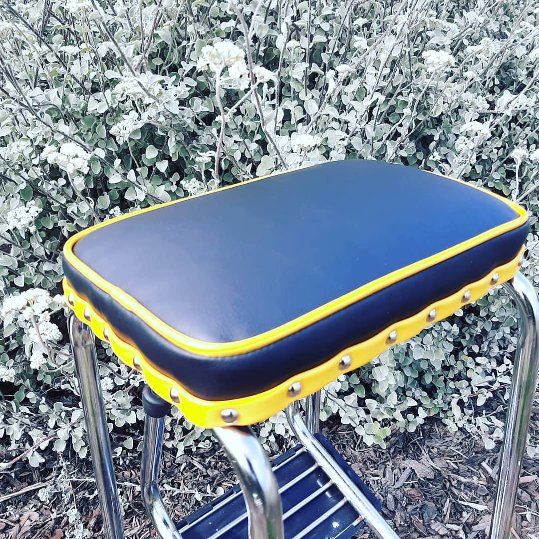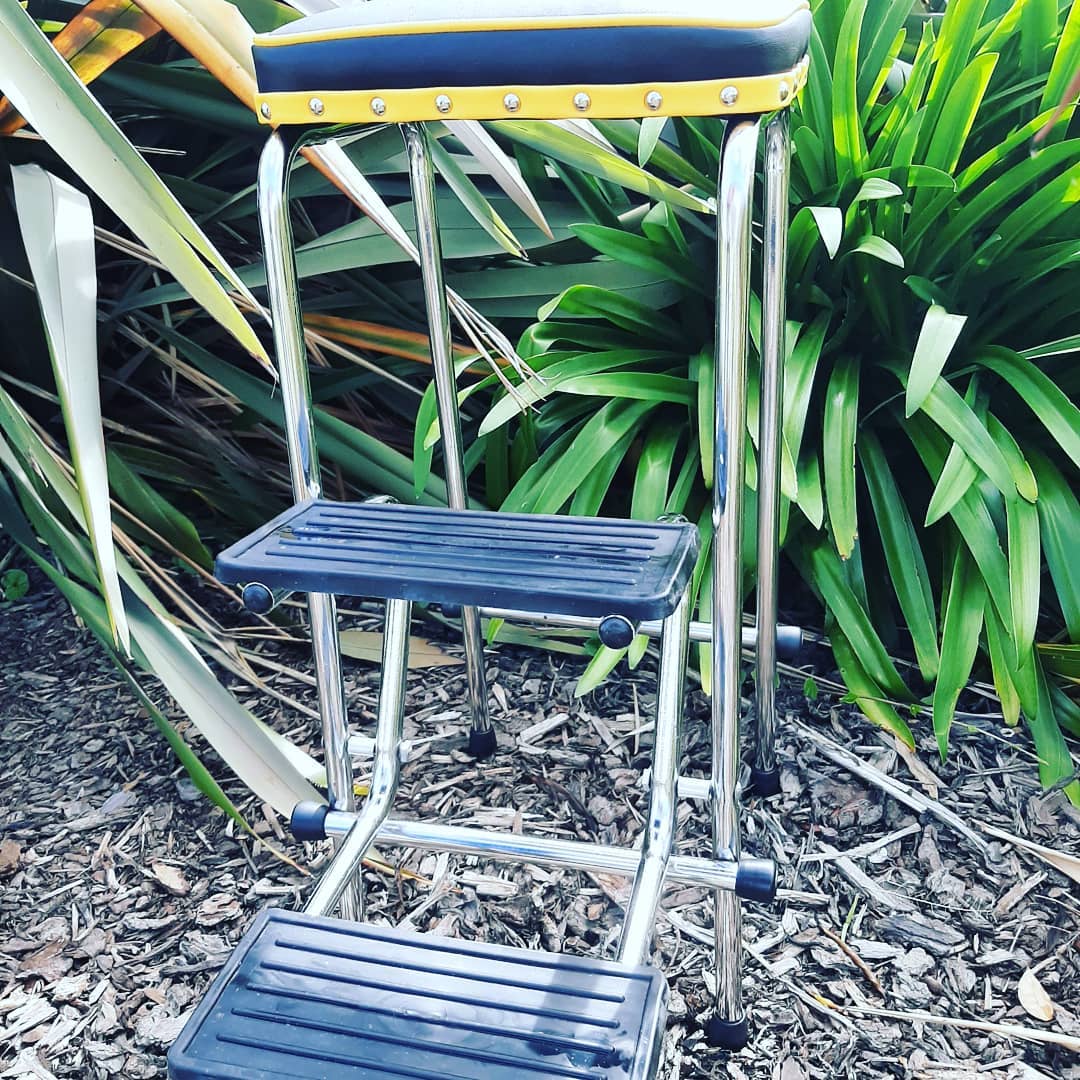 This funky step stool - seat has been upcycled from 1960's. Having the fold away step is handy, while out it's a great seat.
