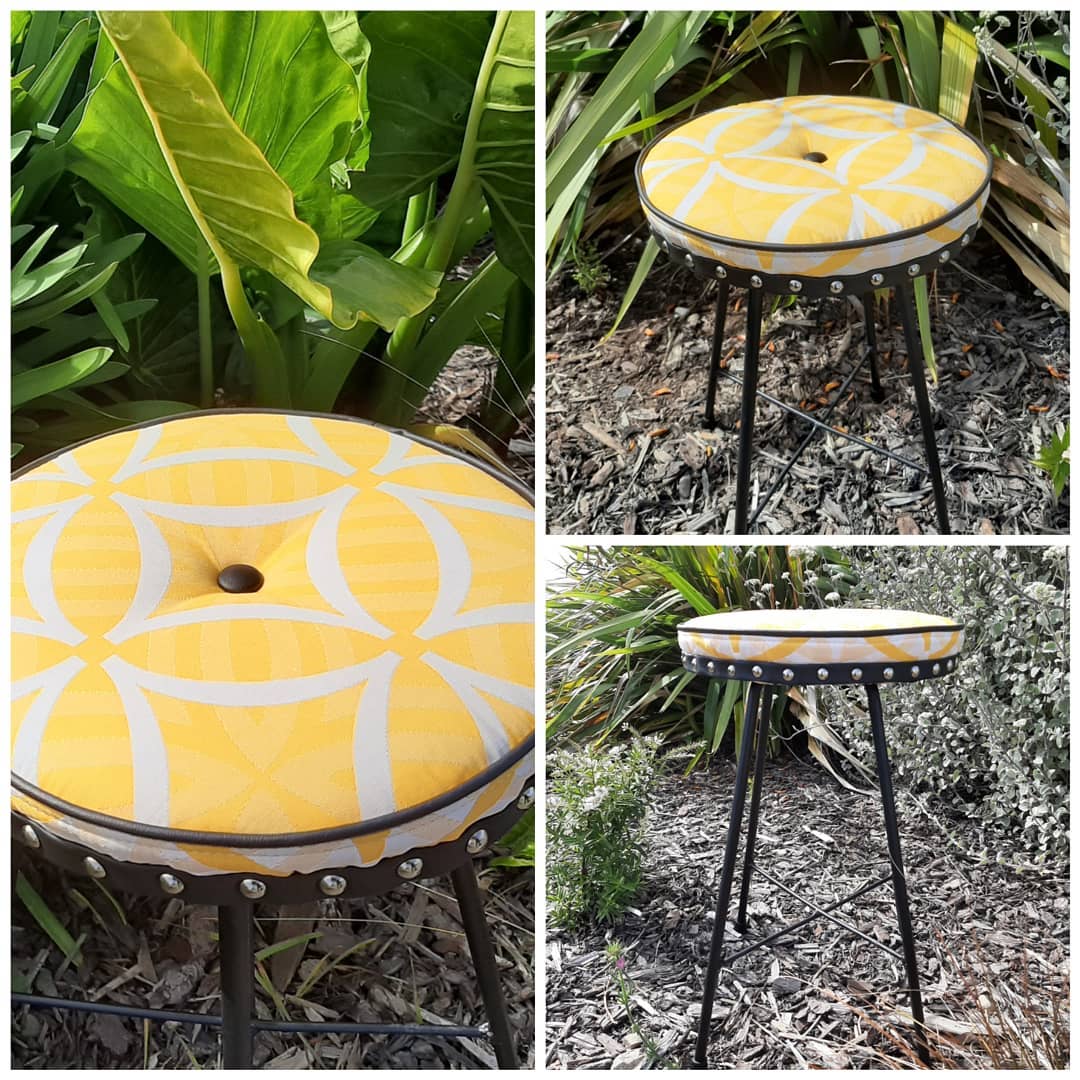 This funky stool - seat has been upcycled from 1960's. The frame has been re sprayed. Upholstered in an indoor outdoor fabric, easy to wipe clean.