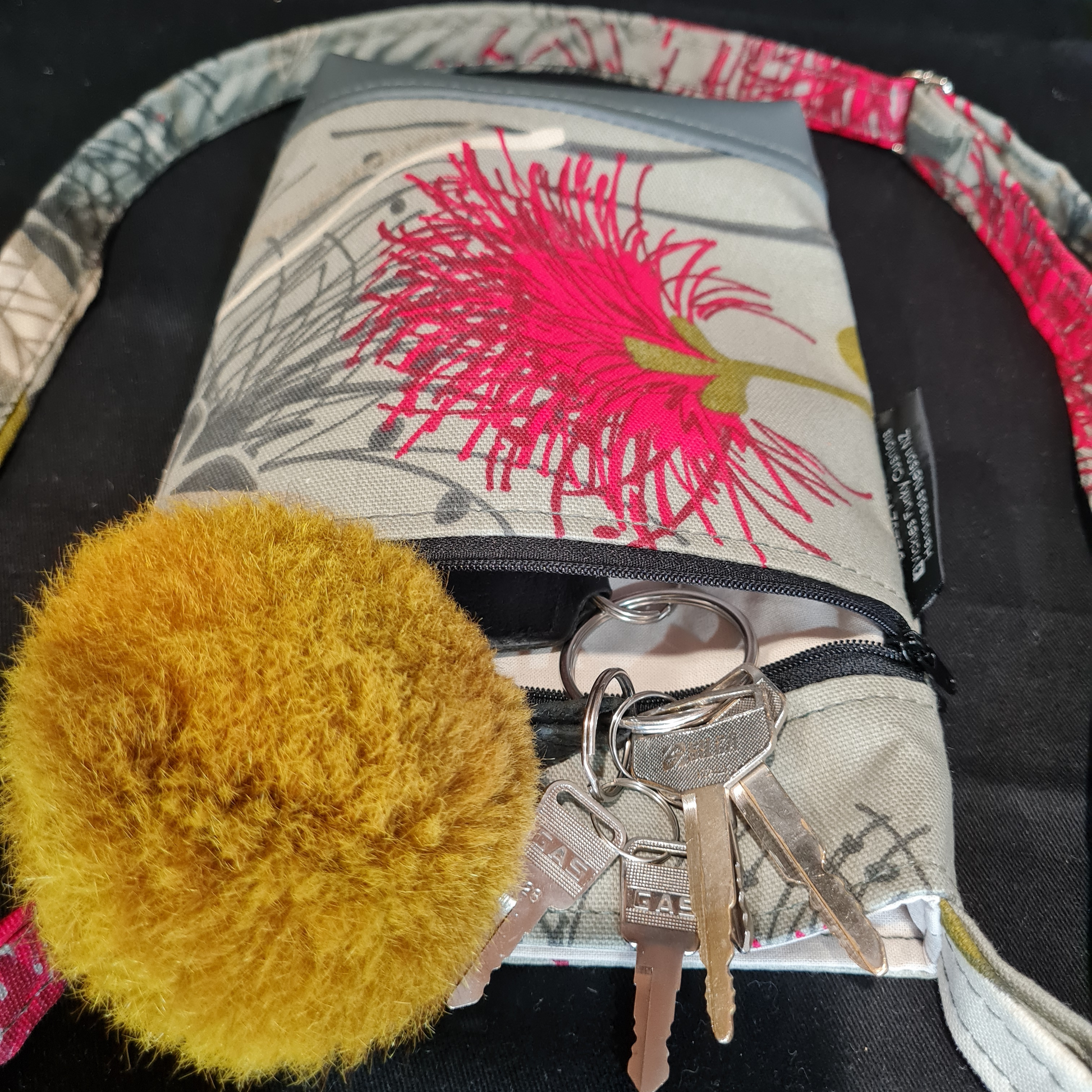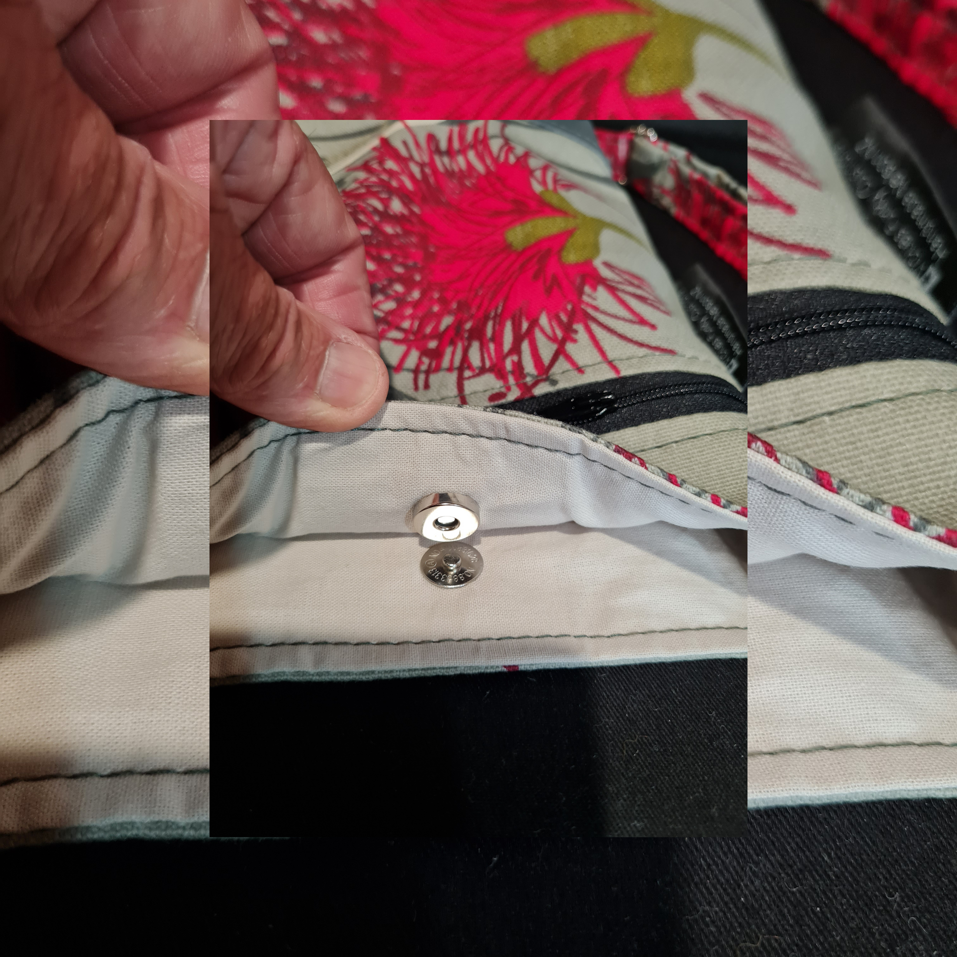 It is lined, has a magnetic dome in main compartment and a zipped outside pocket.