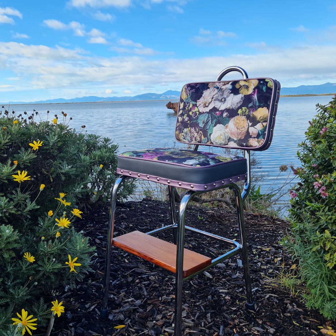 Upholstered in Warwicks Flower bomb velvet and a marine grade vinyl. Rubber stoppers have been replaced. Wonderful stool. Ideal for grandchildren.